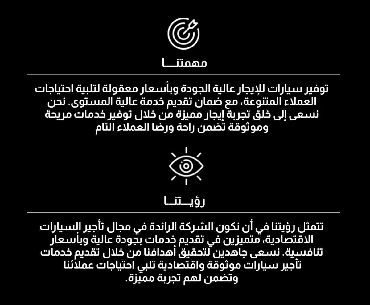 - تقديم خدمات تأجير سيارات ذات جودة عالية تضمن سلامة وراحة العملاء أثناء رحلاتهم.